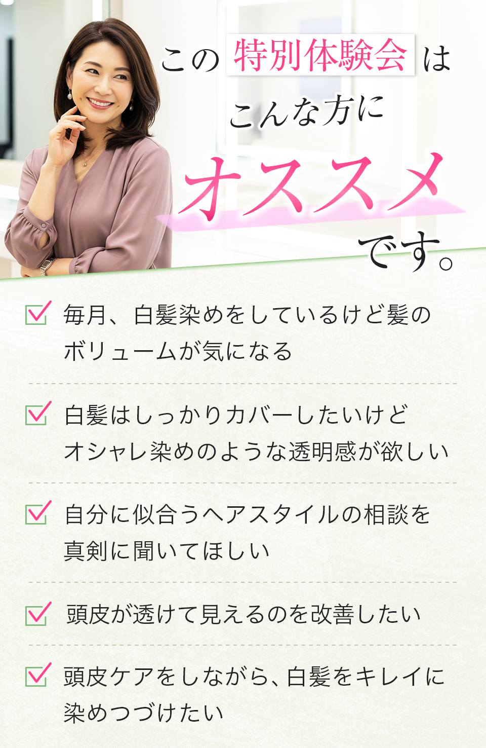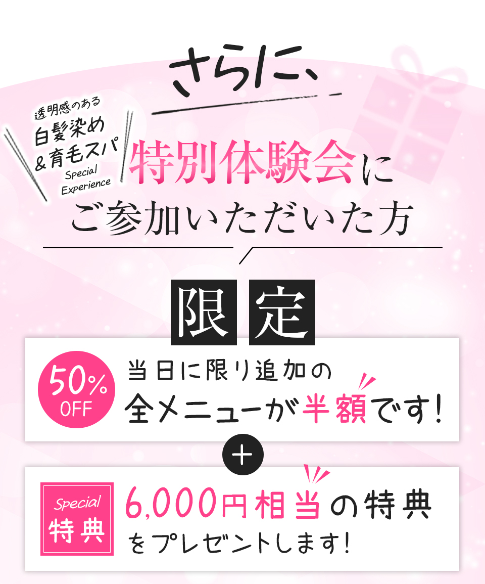 今回の『透明感のある白髪染め&頭皮改善育毛スパ特別体験会』は、