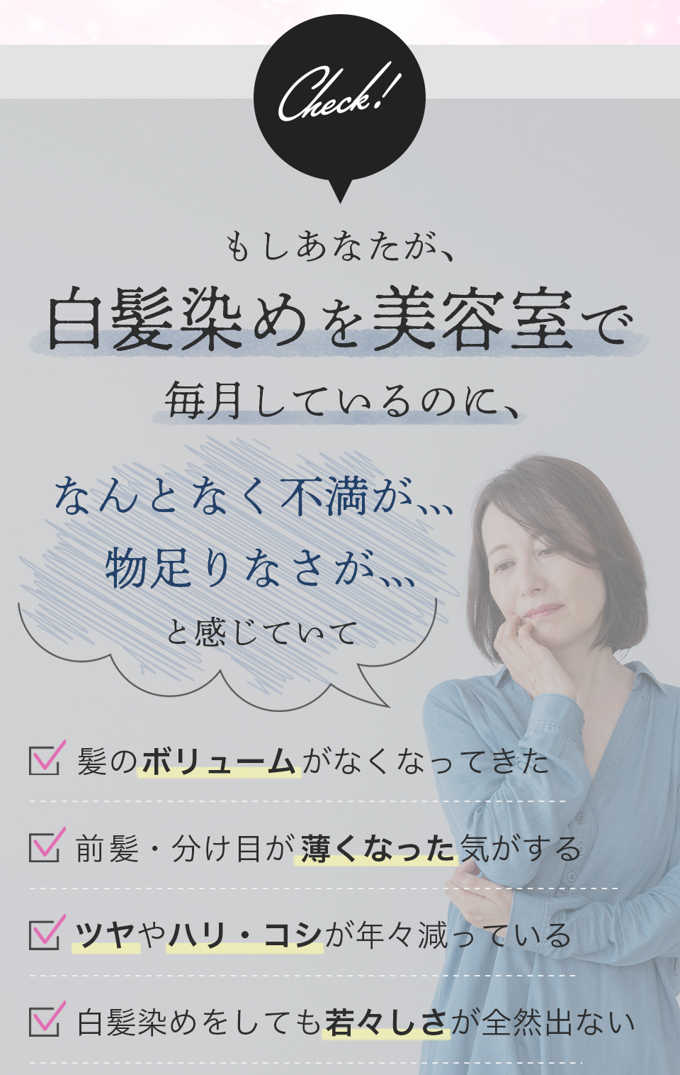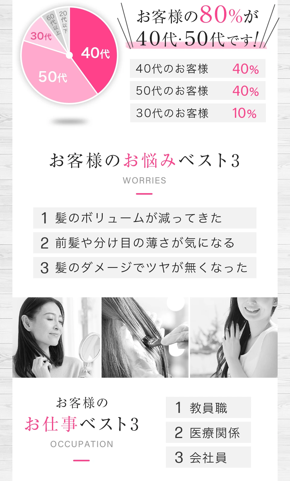 もう一つは当店のNO.1メニュー『透明感のある白髪染め&頭皮改善育毛スパ』を体験してもらうことで、1人くらいは悩みを改善できることを実感していただき、10年後も「理想のヘアスタイル」を手に入れるための「お客様」になってくれると考えたからです。