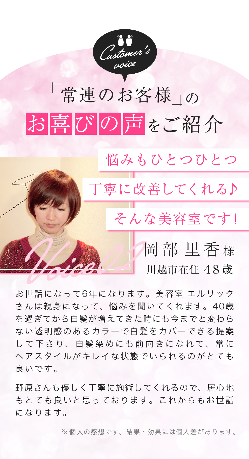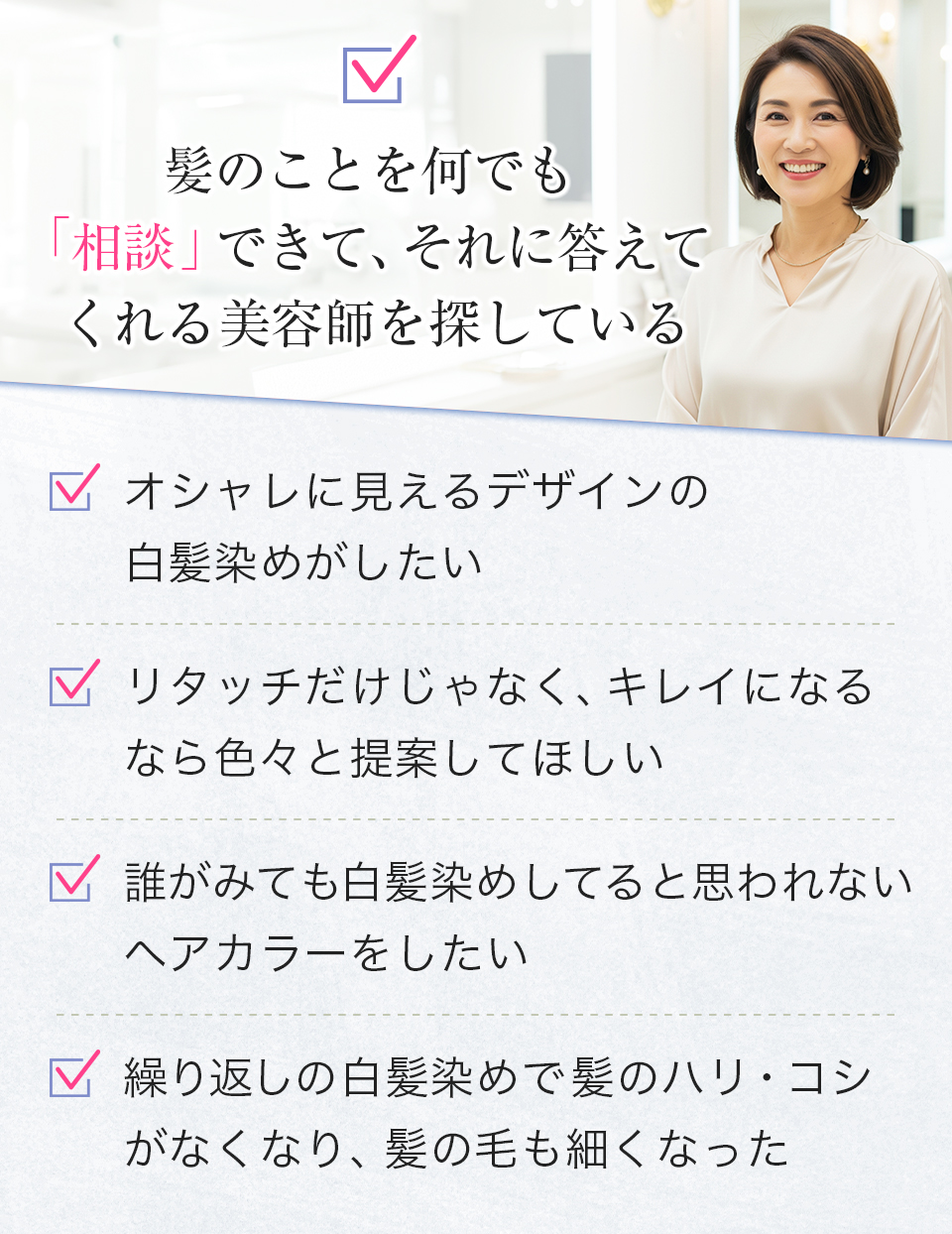 当店の多くのお客様は、マメに「白髪染め・ヘアカラーやヘッドスパ」をするために、わざわざ遠いところからご来店いただいております。