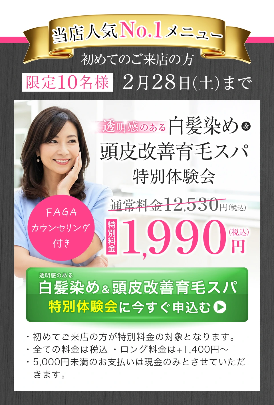 なぜ、12,530円の透明感のある白髪染め&頭皮改善育毛スパ(FAGAカウンセリング付き)と4つの特典が1,990円でできるのか?