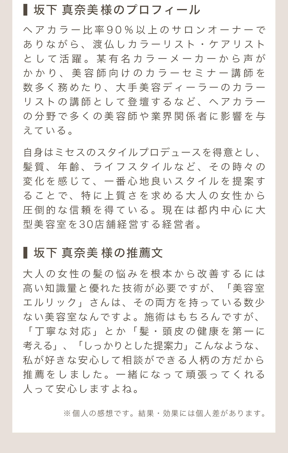 もう一つは当店のNO.1メニュー『透明感のある白髪染め&頭皮改善育毛スパ』を体験してもらうことで、1人くらいは悩みを改善できることを実感していただき、10年後も「理想のヘアスタイル」を手に入れるための「お客様」になってくれると考えたからです。