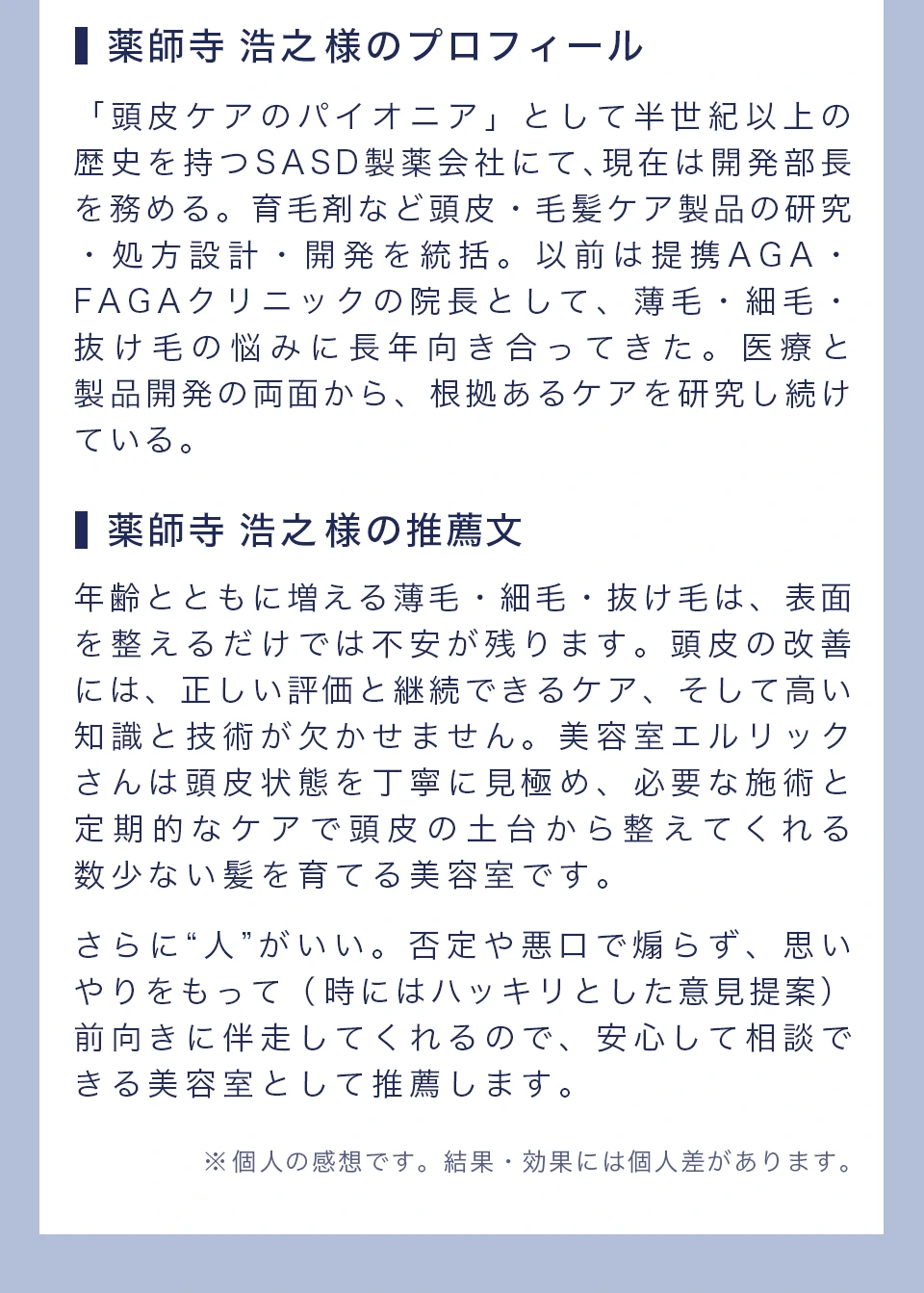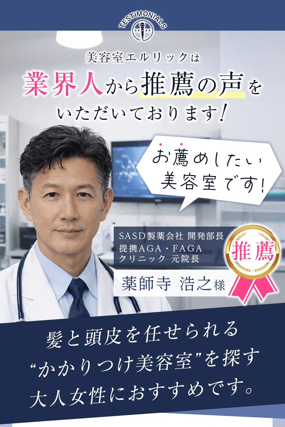 1つは、これくらいのインパクトがあれば、今通っている美容室があるけど「我慢して言えない」、「相談しづらい」、「髪・頭皮・ヘアスタイルの悩みにもう一度向き合いたい」そんなあなたにご来店してもらえるかな、と思ったからです。