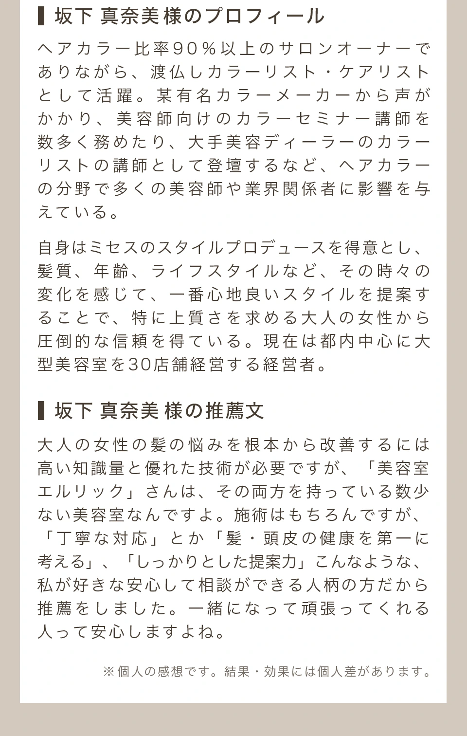もう一つは当店のNO.1メニュー『透明感のある白髪染め&頭皮改善育毛スパ』を体験してもらうことで、1人くらいは悩みを改善できることを実感していただき、10年後も「理想のヘアスタイル」を手に入れるための「お客様」になってくれると考えたからです。